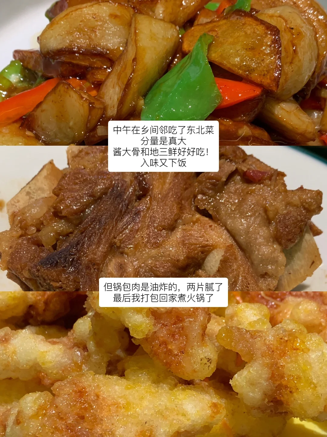▪️中午吃了东北菜,菜量是真的挺大的,人均五六十,地三鲜和酱大骨好下饭,但是锅包肉好腻哈哈哈哈,我吃不来油炸的东西,最后打包回家煮火锅里面了