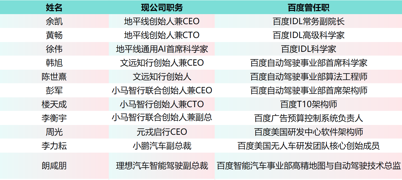 据时代周报记者不完全统计,百度自动驾驶业务至少先后出走50位技术大牛,如今如满天星,散落在L4自动驾驶解决方案、整车自动驾驶开发、智能汽车芯片、车路协同方案等相关领域的企业。今年,地平线(9660.HK)、小马智行(Pony)、文远知行WeRide(WRD)等自动驾驶技术企业先后上市成功,而他们的创始人或高管,都曾在百度任职。最近一次,百度智能驾驶事业群组(IDG)负责人、百度集团资深副总裁、CEO助理李震宇离职。
