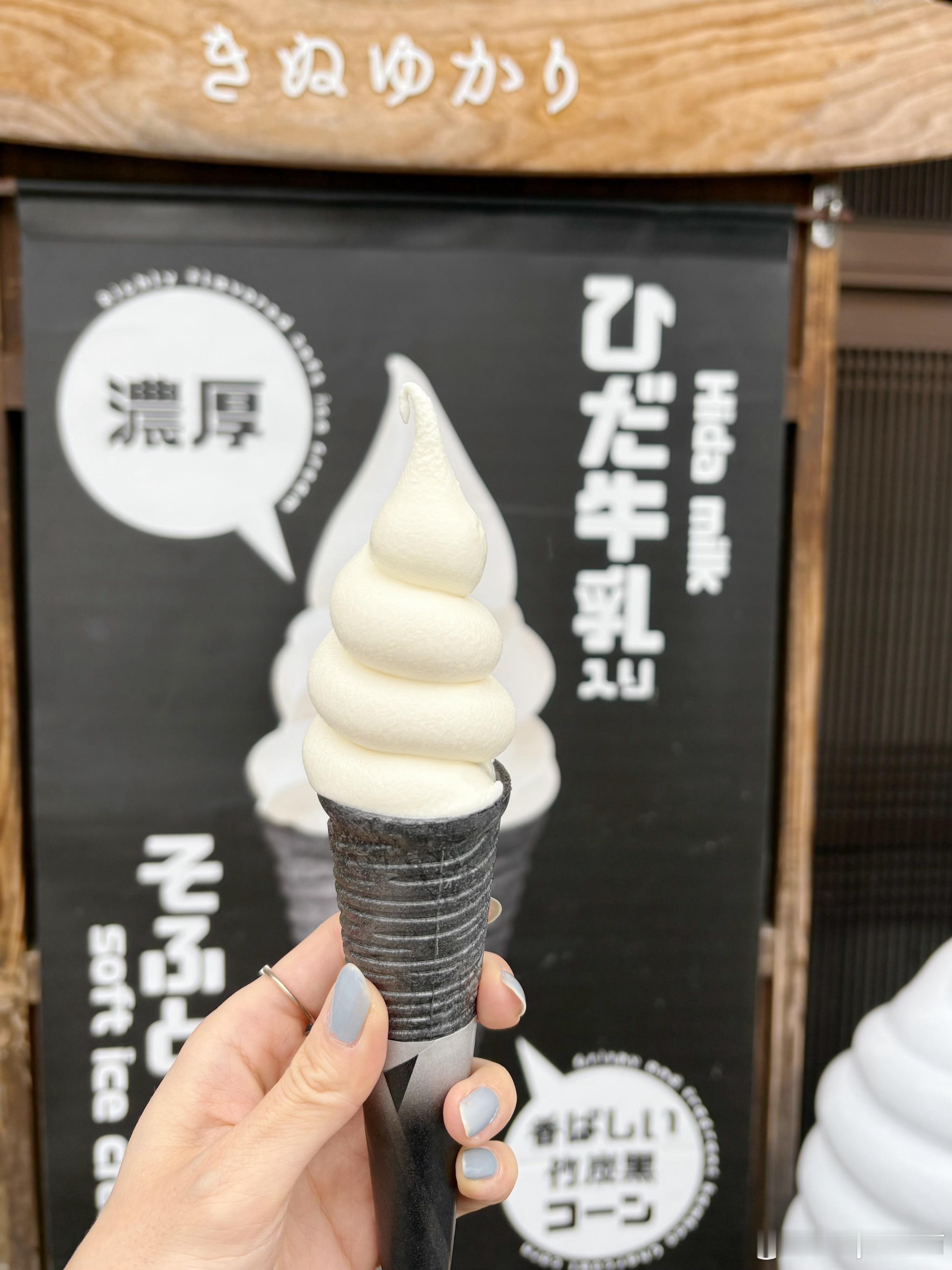 飞驒牛乳的冰淇淋🍦牛奶味道很浓厚!黑竹炭脆筒,身为北方人真的很喜欢冬天室外吃冰淇淋[允悲]