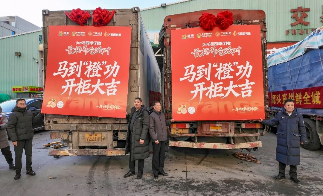 活动最激动人心的时刻——开柜仪式,在现场嘉宾共同倒数中举行。首衡集团、云稼集团、辰云泰农业、永泰商贸等多方代表一同拉开柜门,为首个满载“四季7橙”的货柜揭幕。随着柜门开启,橙香四溢,象征着“四季7橙”在华北市场的供应链全面启动,全年鲜橙供应自此正式启航。