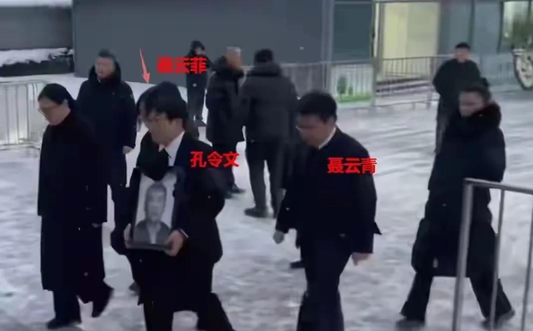 身为长子的孔令文,手捧父亲遗像,走在前面,聂云青和聂云菲则分列两边,紧随其后。