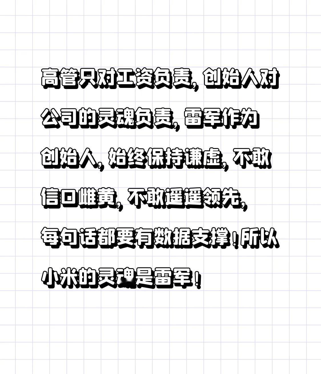高管只对工资负责,创始人对公司的灵魂负责,雷军作为创始人,始终保持谦虚,不敢信口雌黄,不敢遥遥领先,每句话都要有数据支撑!所以小米的灵魂是雷军!
