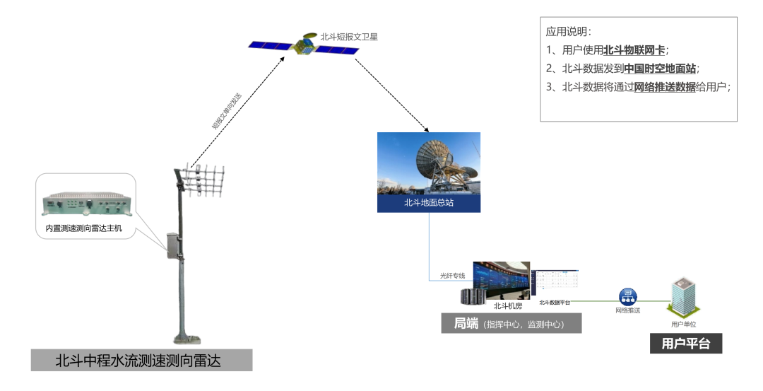 核心为北斗中程水流测速测向雷达主机,搭配北斗多模采集遥测终端(RTU)PR01、北斗三号短报文数传/船载终端PD19等配套设备,负责现场水流信号采集、初步处理与数据封装。可实现无人值守式自动监测,降低人工运维成本。