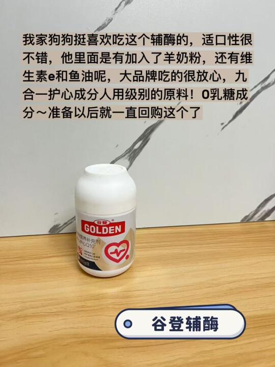 我家狗狗挺喜欢吃这个辅酶的,适口性很不错,他里面是有加入了羊奶粉,还有维生素e和鱼油呢,大品质吃的很放心,九合一护心成分人用级别的原料!0乳糖成分~准备以后就一直回购这个了!