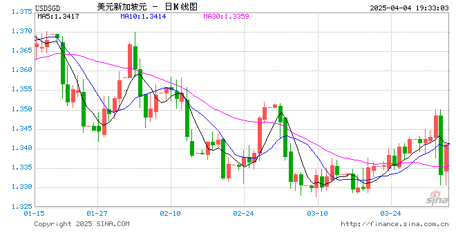新浪外汇消息2025年04月04日,截至19时32分,外汇市场上美元兑新加坡元汇率突破1美元兑换1.3410新加坡元。涨幅为0.5149%