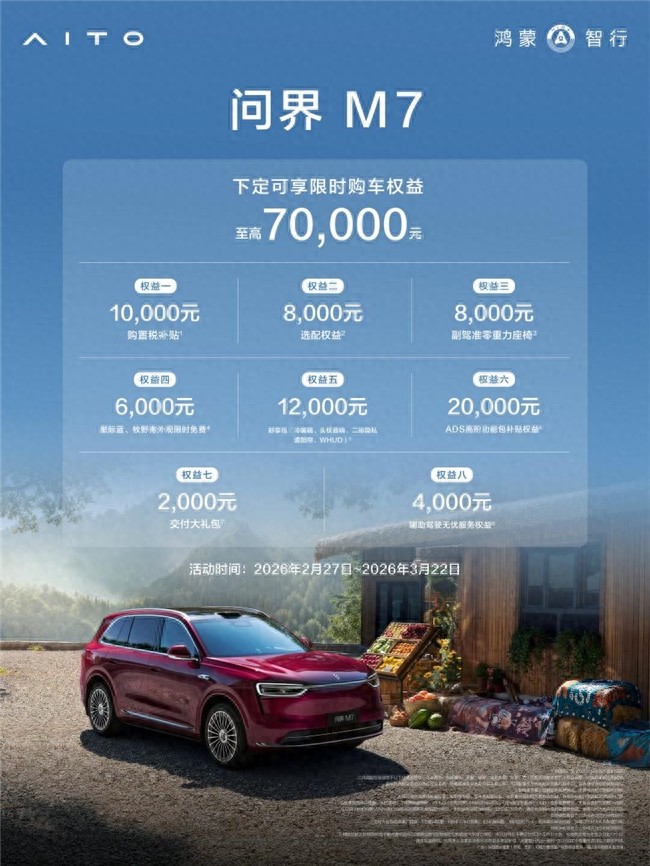 即日起至3月22日,下定问界M7的用户将有机会享受高达70,000元的权益礼包。这个包含“购置税补贴”的全新权益组合,无疑是对消费者的一次重磅回馈。具体来看,此次权益不仅涵盖了价值8,000元的选配权益和价值8,000元的副驾准零重力座椅,还打包了价值12,000元的舒享包以及价值20,000元的ADS高阶功能包补贴,几乎囊括了用户最关注的舒适与智能配置升级。