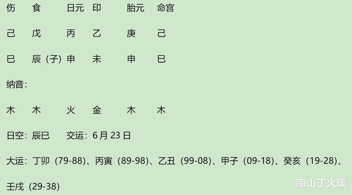 此年,大运甲偏印合己伤,流年戊食生庚财;大运子合申,流年午与月支辰夹巳,小限辰与胎元申拱子。