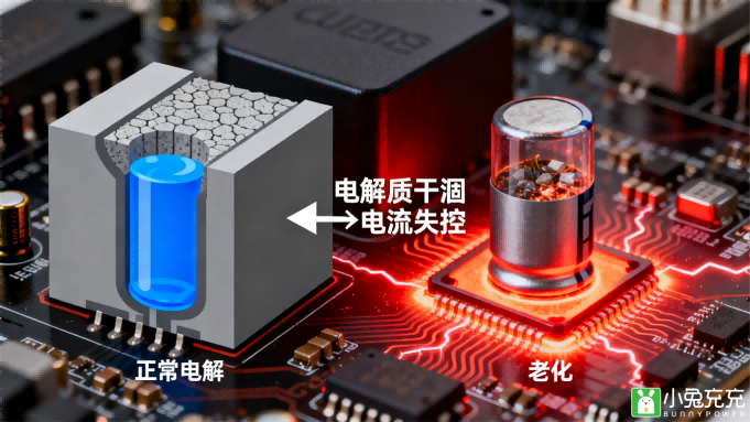 电解电容是充电器中的关键元件,负责平滑电流。随着使用时间增长,电容内部的电解质会逐渐干涸,形成“电解质结晶”。