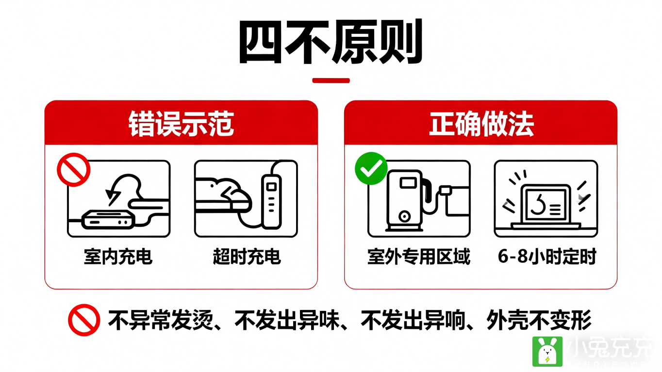 充电环境同样关键:绝对不能在室内、楼道或安全出口处充电,这些地方一旦起火,后果不堪设想。应选择室外专用充电区域,远离易燃物。