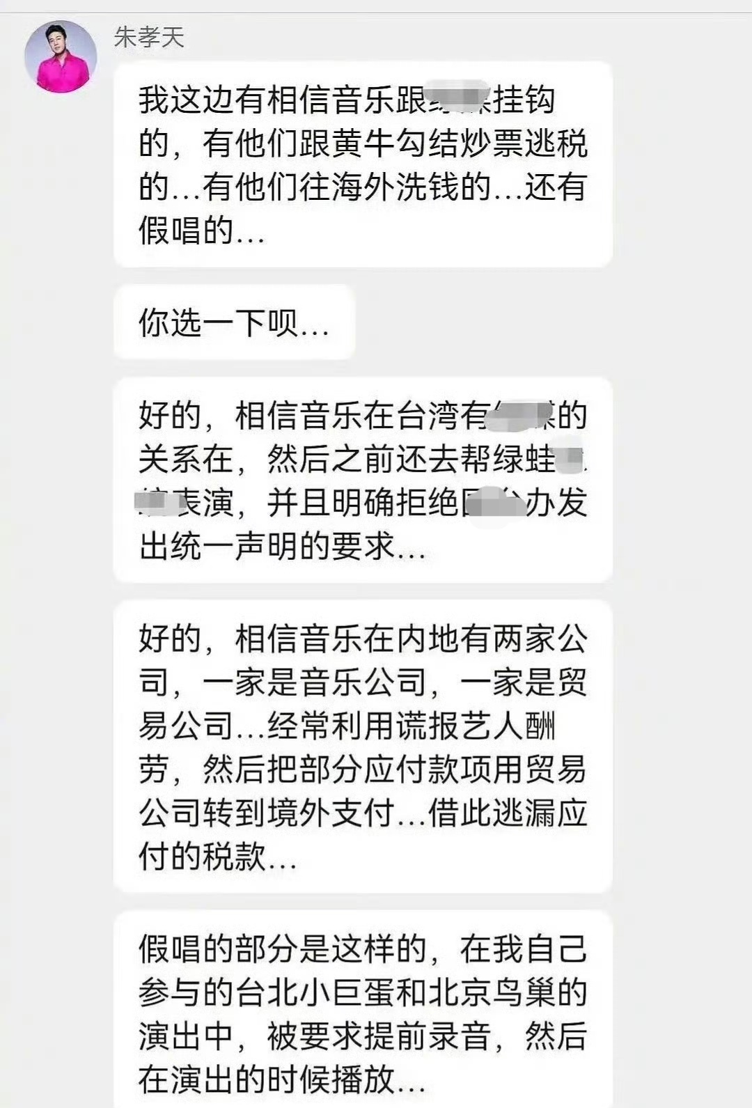 除了内涵以外,近日朱孝天又再度“重拳”出击,爆出三大猛料,手撕相信音乐。