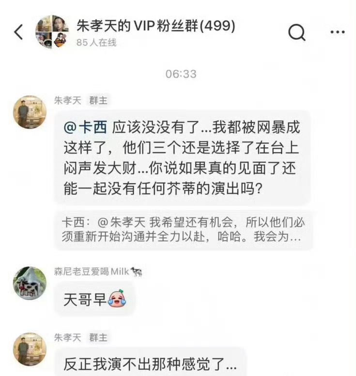 朱孝天方面除了网上接连曝出的粉丝群聊天记录以外,他本人目前也没有针对网络上各种爆料做出回应。