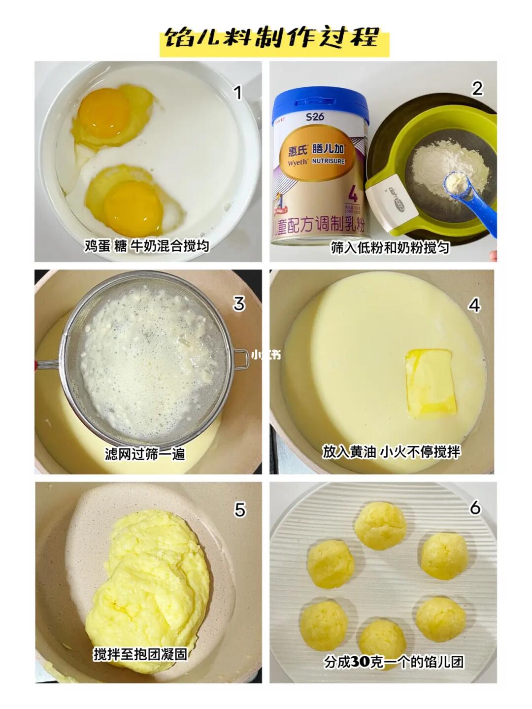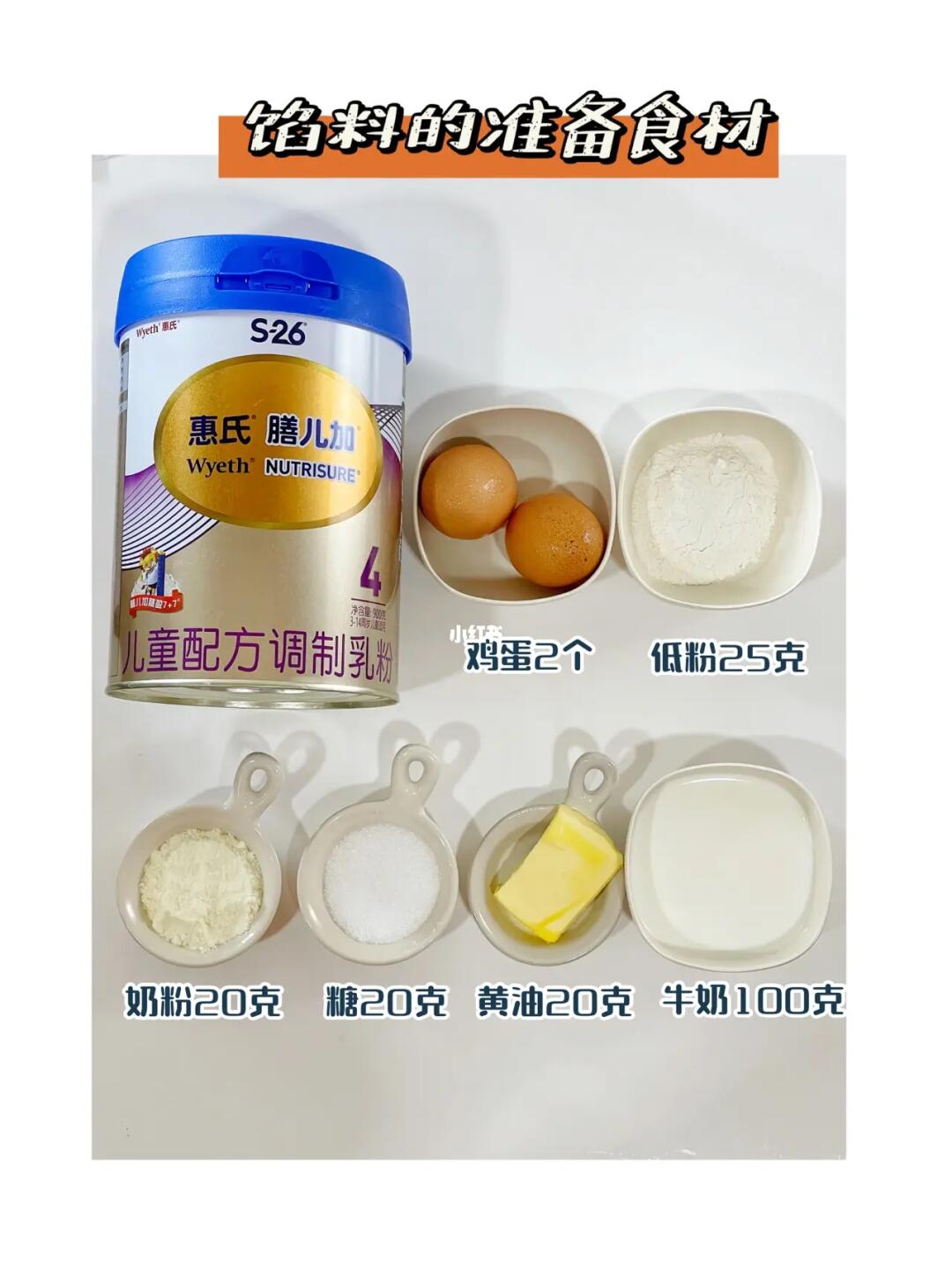 B:馅儿料:惠氏膳儿加奶粉20克、鸡蛋2个、低筋面粉25克、糖20克、黄油20克、牛奶100克。