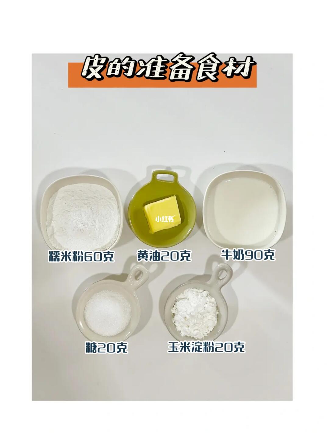 A:外皮:糯米粉60克、牛奶90克、黄油20克、玉米淀粉20克、糖20克。