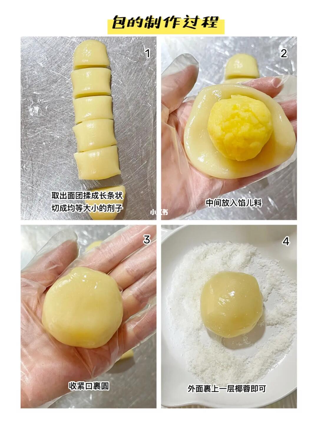🔹面团冰箱取出后,揉成长条状,切成均等大小的剂子。揉圆再按成饼状,中间包住馅儿料,收紧口,再揉圆,裹上一层椰蓉就可以啦。