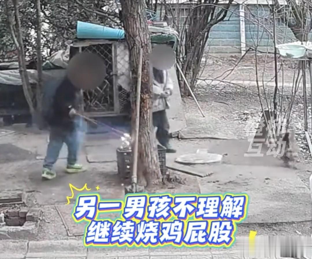 随后,其中一名男孩甚至拿着烟花,继续去追小区里的鸡取乐。