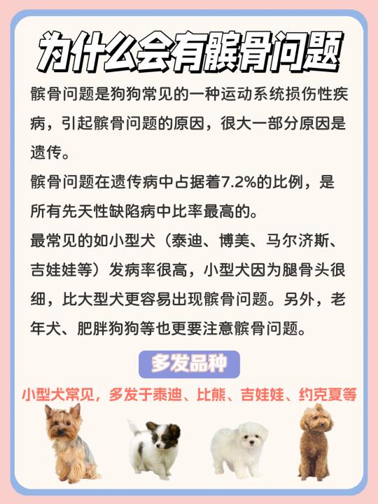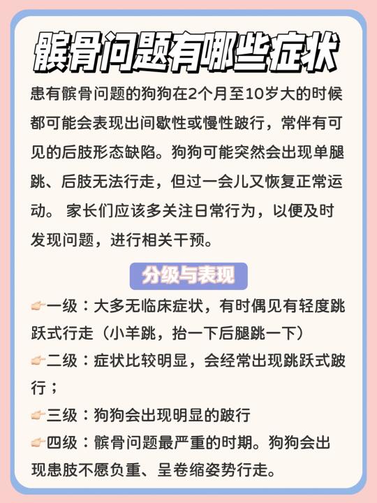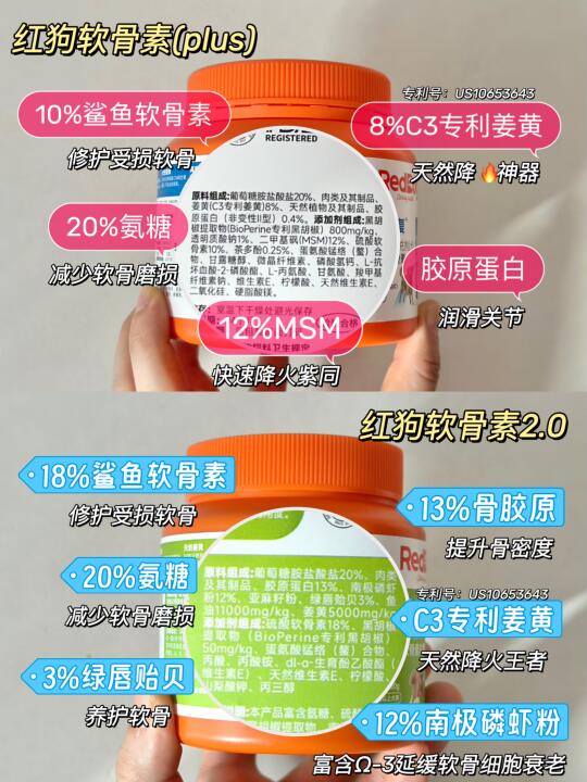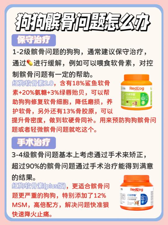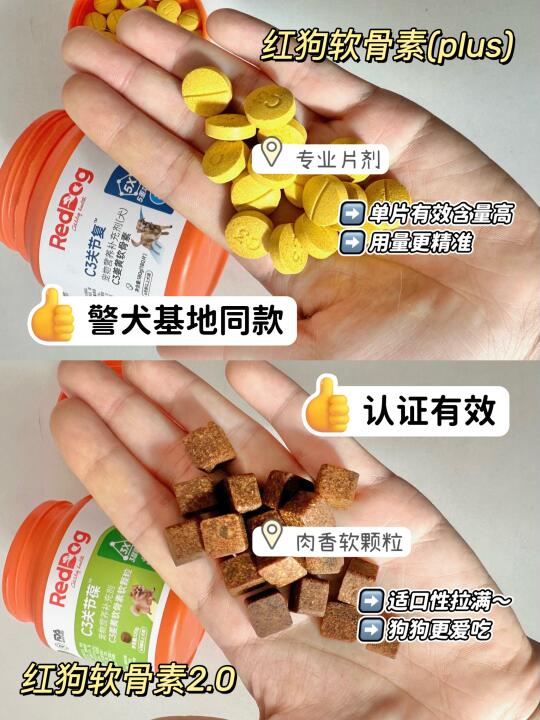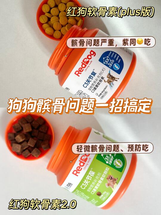 你家的狗狗会不会总走着走着突然抬起后腿“金鸡独立”?过几秒又恢复正常?别以为它在演戏!要当心,这是髌骨问题的典型信号! 👀为什么会有髌骨问题? 髌骨问题是狗狗常见的一种运动系统损伤性疾病,引起髌骨问题的原因,很大一部分原因是遗传。 最常见的如小型犬(泰迪、博美、马尔济斯、吉娃娃等)发病率很高,小型犬因为腿骨头很细,比大型犬更容易出现髌骨问题。另外,老年犬、肥胖狗狗等也更要注意髌骨问题。 👀髌骨问题有哪些症状? 患有髌骨问题的狗狗在2个月至10岁大的时候都可能会表现出间歇性或慢性跛行。狗狗可能突然会出现单腿跳、后肢无法行走,但过一会儿又恢复正常运动。家长们应该多关注日常狗狗行为。 👀髌骨问题分级与表现: 🐶一级:大多无临床症状,有时偶见有轻度跳跃式行走(小羊跳,抬一下后腿跳一下) 🐶二级:症状比较明显,会经常出现跳跃式跛行 🐶三级:狗狗会出现明显的跛行 🐶四级:髌骨问题最严重的时期。狗狗会出现患肢不愿负重、呈卷缩姿势行走 👀狗狗髌骨问题怎么办? 💎保守治疗: 1-2级髌骨问题的狗狗,通常建议保守治疗,通过药物进行缓解,例如可以喂食软骨素,对控制髌骨问题有一定的帮助。 💎手术治疗: 3-4级髌骨问题基本上考虑通过手术来矫正,超过90%的髌骨问题通过手术治疗能得到满意的结果。 我家狗狗之前就是老爱“三脚跳”,感觉不对劲就带去检查了。 我是选择了保守治疗,做了功课后,才选择了红狗软骨素(plus版), 它里面特别添加了: 🚩12%MSM,高倍配方,可以快速降火,帮助狗狗止痛; 🚩8%C3专利姜黄(专利号US10653643),4H快速缓解狗狗关节问题; 🚩10%鲨鱼软骨素+20%氨糖:比较高的软骨素含量,精准修复受损软骨; 🚩而且这款还是警犬基地同款,华中农业大学和南京警犬基地双认证有效; 🚩加上红狗家是国内十几年的老牌子了,在做宠物营养这方面也比较专业~ 他家另外一款,红狗软骨素2.0,是没有添加MSM的,如果是轻微髌骨问题,或者是想要预防的狗狗就可以选择这款: ✅18%鲨鱼软骨素+20%氨糖+3%绿唇贻贝,帮助狗狗修护软骨细胞,降低磨损,养护软骨; ✅13%骨胶原,帮助提升骨密度,做到软硬骨同补。 我家另一只没有发病的约克夏在吃的就是这款!还是软肉香颗粒的,适口是很好,狗狗很爱吃!
