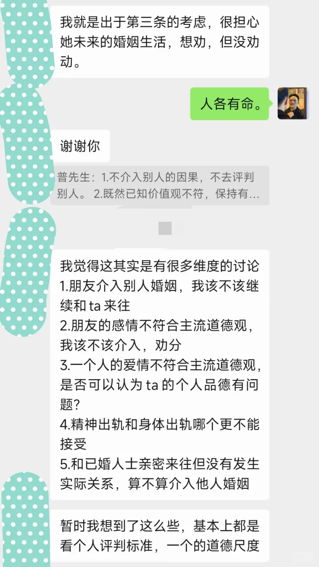 1.朋友介入别人婚姻,我该不该继续和ta来往 2.朋友的感情不符合主流道德观,我该不该介入,劝分 3.一个人的爱情不符合主流道德观,是否可以认为ta的个人品德有问题? 4.精神出轨和身体出轨哪个更不能接受 5.和已婚人士亲密来往但没有发生实际关系,算不算介入他人婚姻