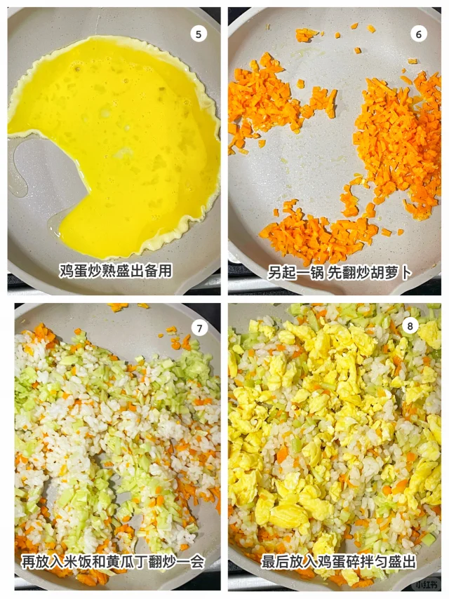 🔹腌制的时候可以炒米饭。黄瓜去皮切丁,胡萝卜去皮切丁,鸡蛋炒熟备用。锅中油热后放入胡萝卜翻炒断生,再放入米饭和黄瓜丁翻炒一会,最后放入鸡蛋碎拌匀盛出备用。