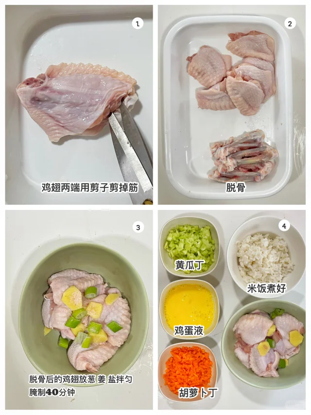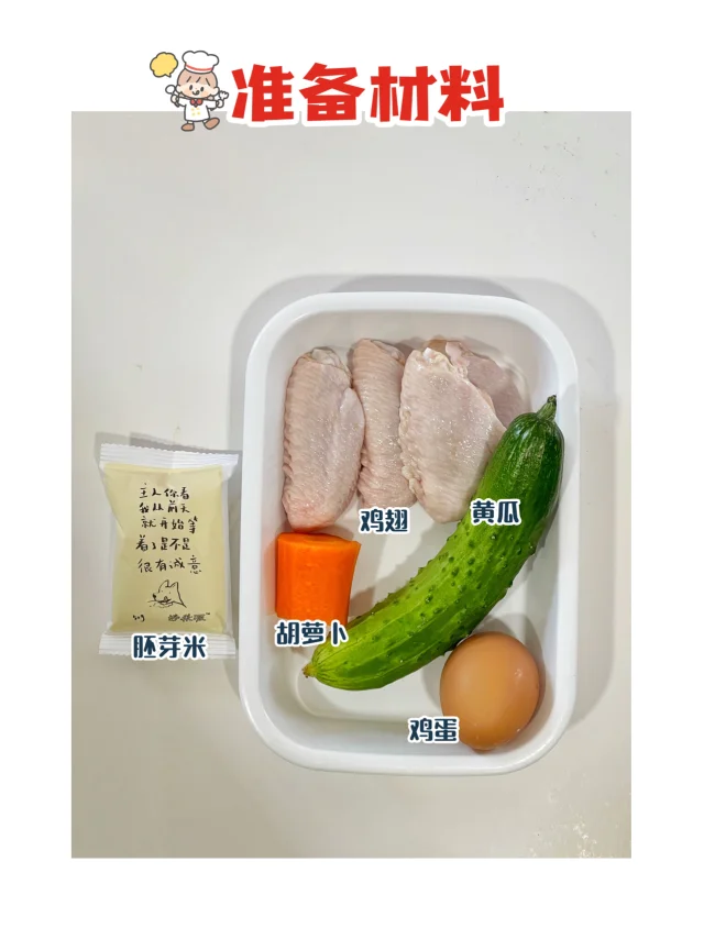 ✅准备材料:鸡翅、胡萝卜、黄瓜、鸡蛋、胚芽米。
