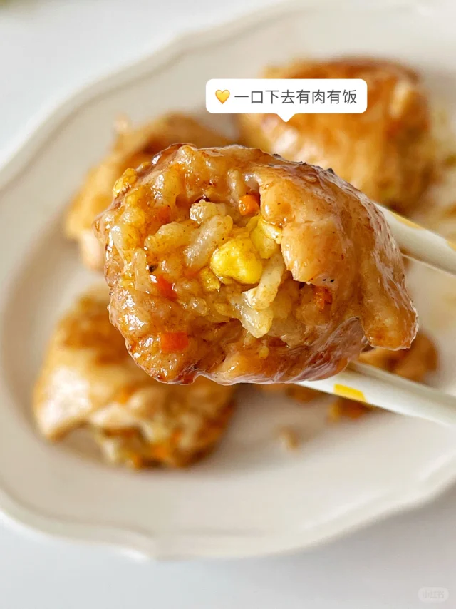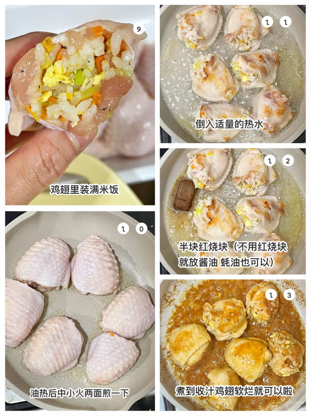 🔹把炒好的米饭依次装入鸡翅里按压紧一些。另起一锅油热后,放入鸡翅中小火两面煎一下,倒入适量的热水,半块红烧块(没有红烧块就放一点酱油、蚝油)盖上盖子焖煮到鸡翅软烂,收汁即可。