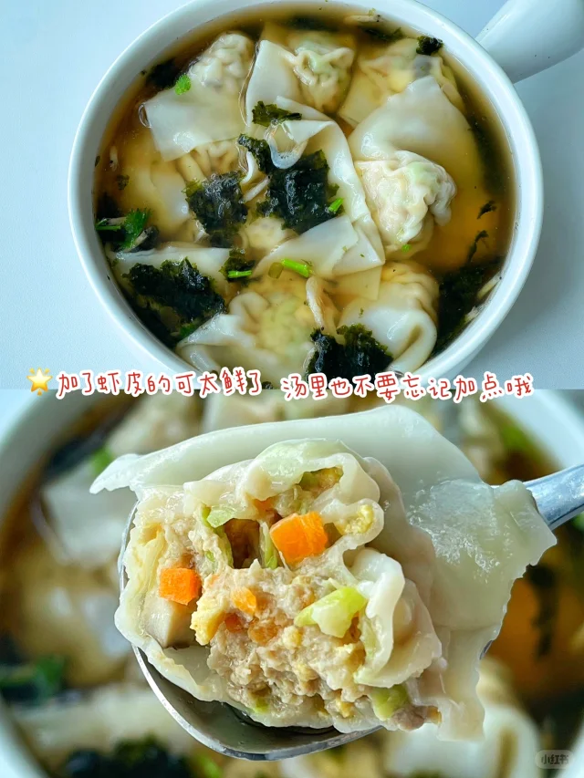 ❗️馄饨汤:碗里放一勺味极鲜+一点虾皮+香菜末+紫菜碎 用煮馄饨的开水浇在上面再放入煮好的馄饨,味道绝绝子[斜眼R]