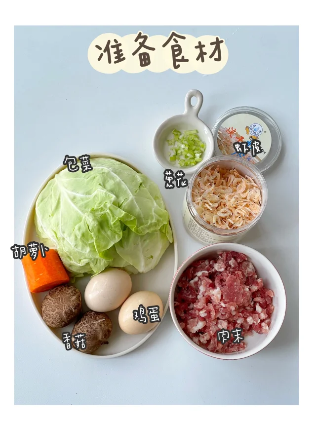 ✅准备食材:肉末、包菜、鸡蛋、虾皮、香菇、胡萝卜、葱花.