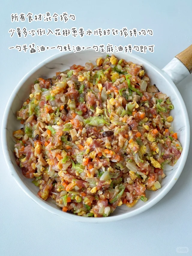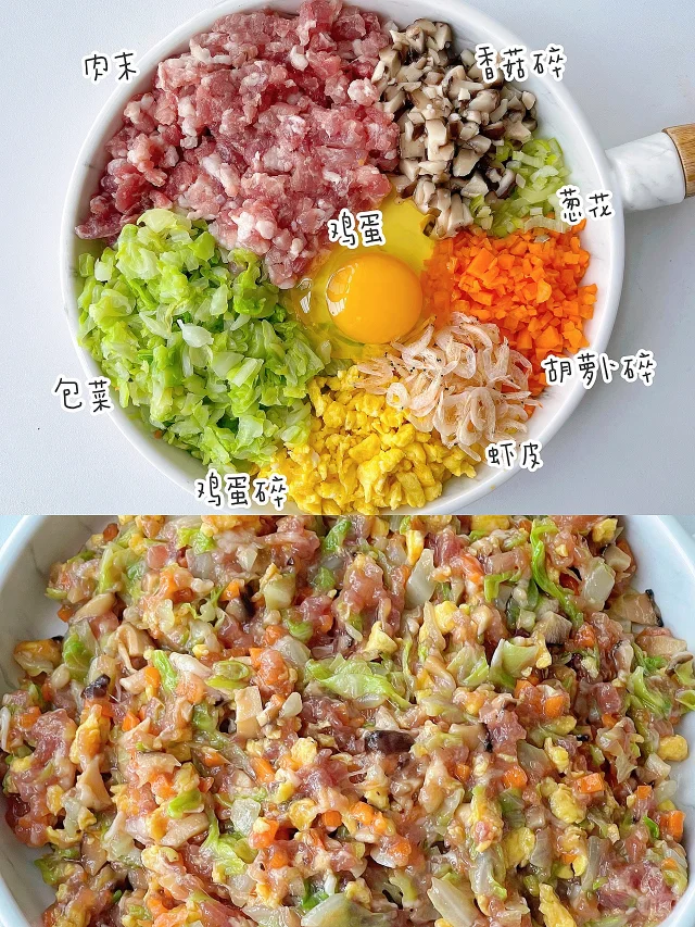🔹包菜、香菇、胡萝卜切碎末.(包菜和香菇提前焯水).肉末+包菜碎+香菇+胡萝卜+适量虾皮+鸡蛋碎+一个生鸡蛋+葱花混合搅匀.