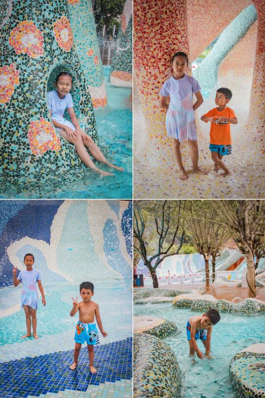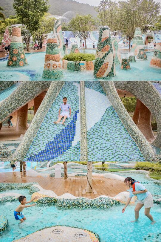 3️⃣站恐龙岛水乐园,马卡龙色彩马赛克艺术风,狠出片📸!2层楼高的恐龙滑梯,炒刺激✨!娃刷了20遍都不腻!漂流河,造浪池也好玩。浅水池对3岁+友好,彩虹喷泉玩到拉不走。 上午10点前/下午4点后人少,记得自带防水手机套。