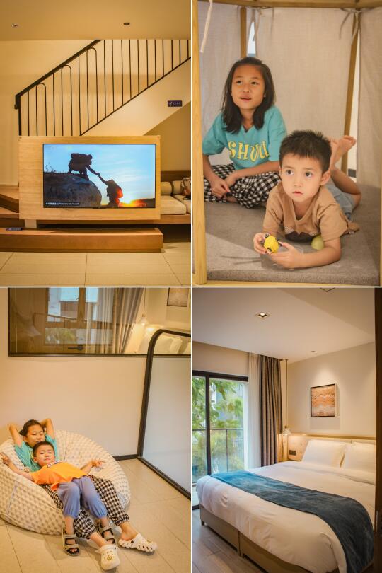 高铁🚄广州出发1.5h到达河源东,先来个紫金八刀汤备能量,六口人一致评价“正”,咸香鸡和河源豆腐也不错。午饭后打车30r(25min)到达春沐原小镇check in蓝葡萄🏨酒店。复式三房套房,二楼有儿童阁楼,娃们喜欢得不得了