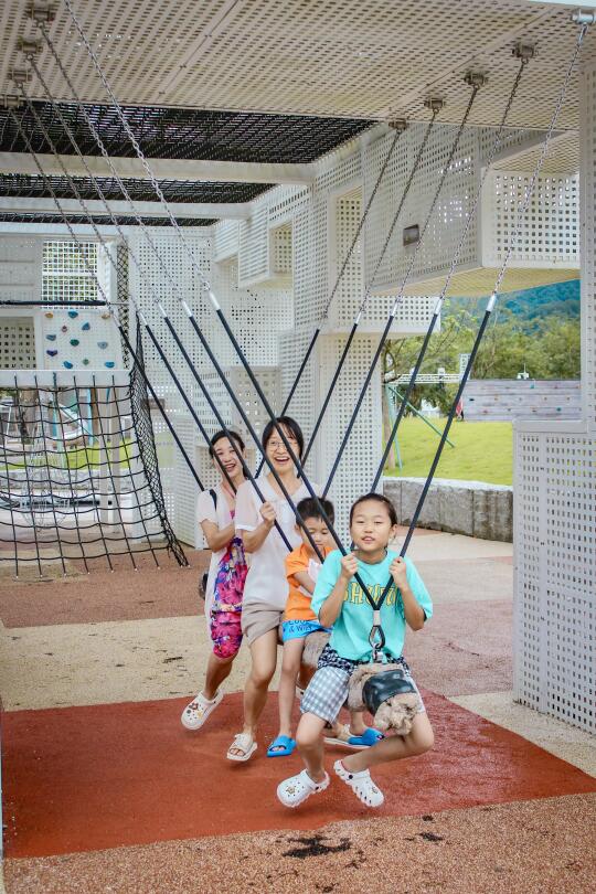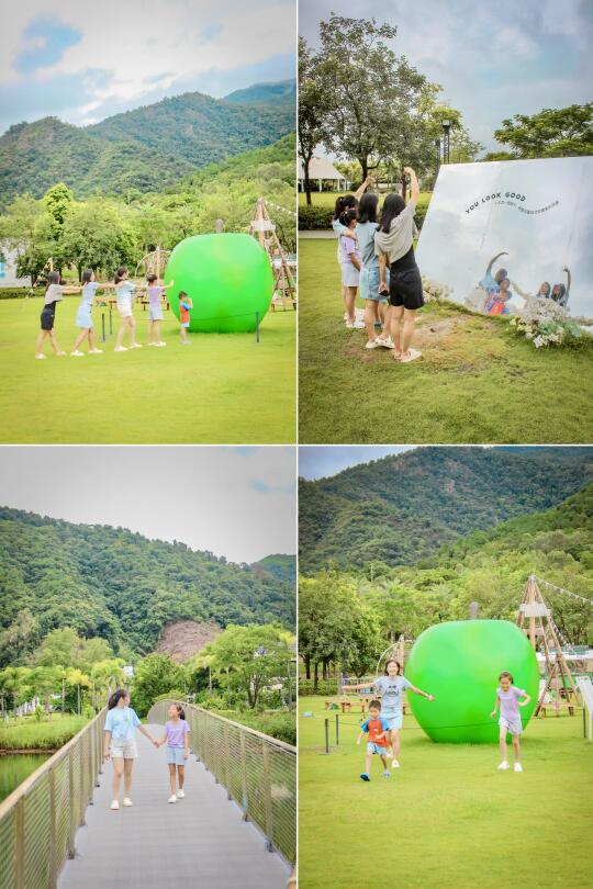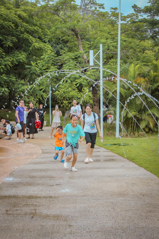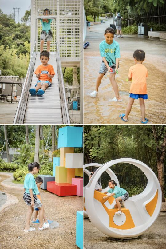 2️⃣站直奔龙骨乐园,超大的无动力玩乐,攀爬网、滑索、沙池、蹦床…娃进去就疯跑2小时!阿基米德取水器、脚踏水车…科技感互动装置连大人都上头!4岁娃zui喜欢延时跳泉,玩完一遍又一遍。玩累了在巨蛋吧凉空调叹奶茶,能量复活💪