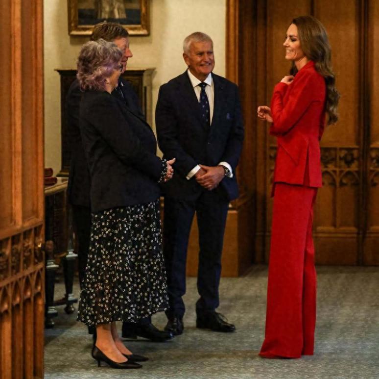1月15日英国王储妃凯特作为橄榄球联盟的皇家赞助人,在温莎城堡为夺得2025年女子橄榄球世界杯冠军的英格兰队举办欢庆招待会,一身中国红西服套装把人惊艳,大波浪卷发也加分。