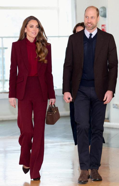 日前,凯特开年后与威廉一起出席活动,也是穿红色西服,只不过是枣红色的衣服,没有中国红西服套装色彩靓丽,但显肤白也显个头高挑。