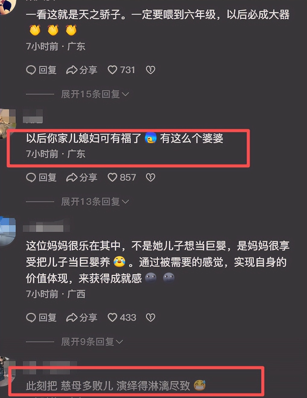这种家长其实乐在其中,她知道自己孩子不是省油的灯,但其实她也不是,而最后嫁到他们家的女孩才是最受苦的,一边要忍受着巨婴男宝妈。
