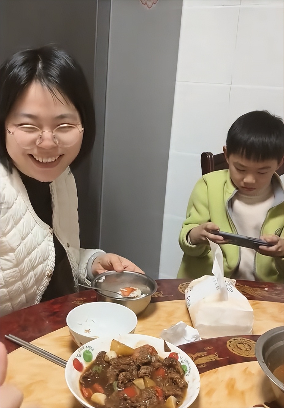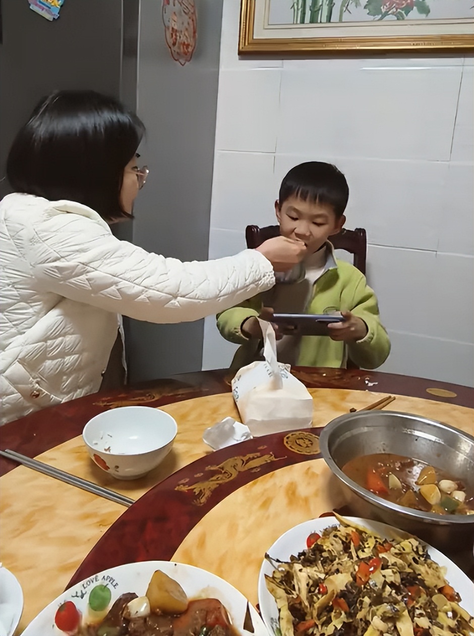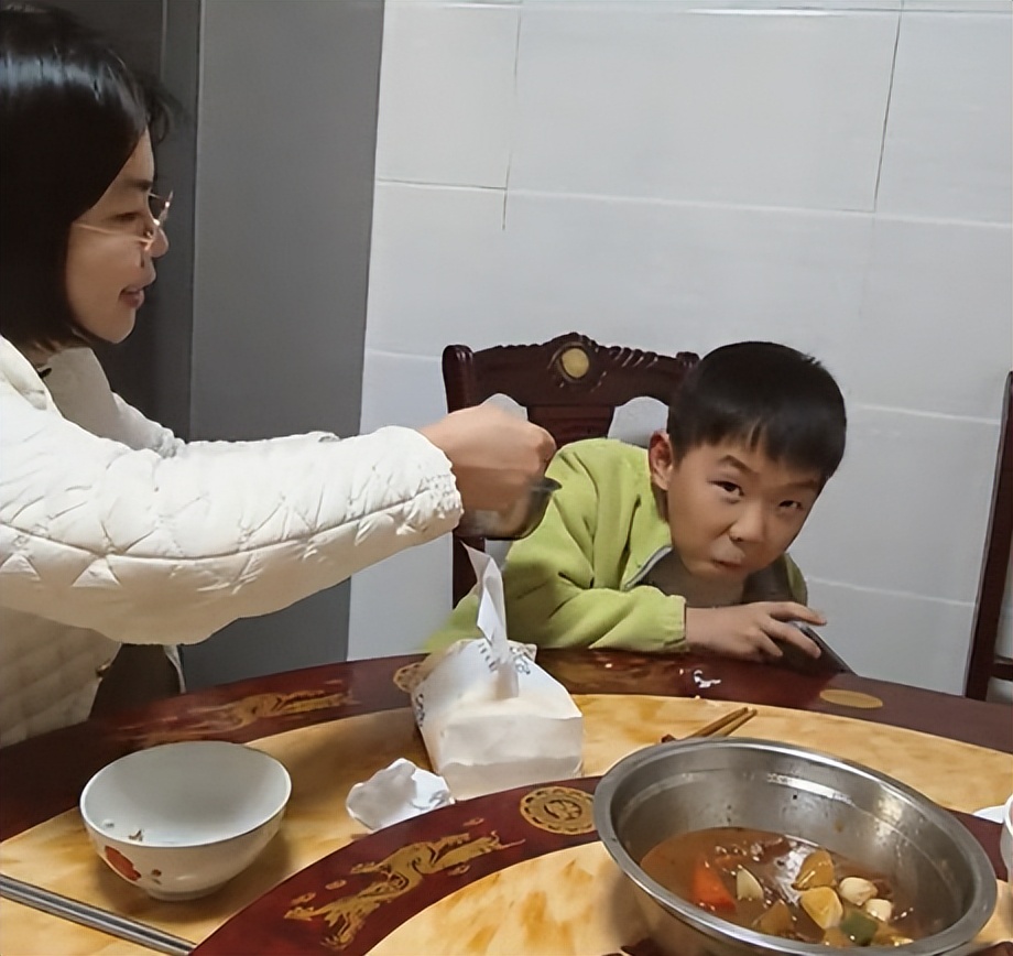 这位母亲一边喂孩子,脸上一边荡漾着幸福的微笑,看样子她一点都不觉得这个三年级孩子身上的状况是十分难搞的。