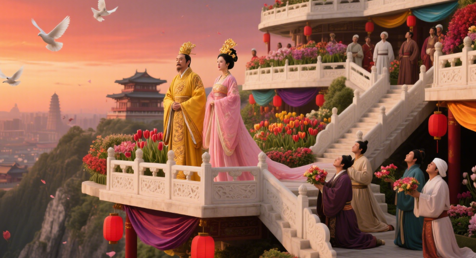 天宝年间,唐明皇专宠杨贵妃,渐疏朝政。大食国王子进言,提议造一座“空中花园”,移栽天下奇花异草,以彰显大唐盛世。