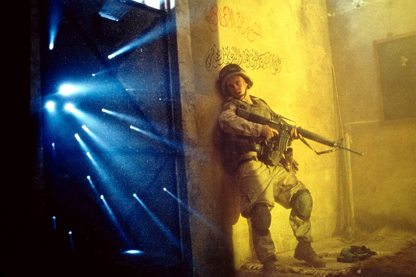《黑鹰坠落》的节奏快得像机关枪,137分钟的片长,几乎没啥喘气的机会。开场20分钟铺垫完背景,直接进入战斗模式,后面全是高强度巷战,剪辑快得飞起但不乱。奥斯卡最佳剪辑实至名归,每场战斗的切换都让你心跳加速,尤其是夜战那段,曳光弹划破夜空,士兵在黑暗中摸爬滚打,剪得跟MV似的,但又不失条理。缺点?可能就是太紧凑了,想尿尿都没时间去厕所。