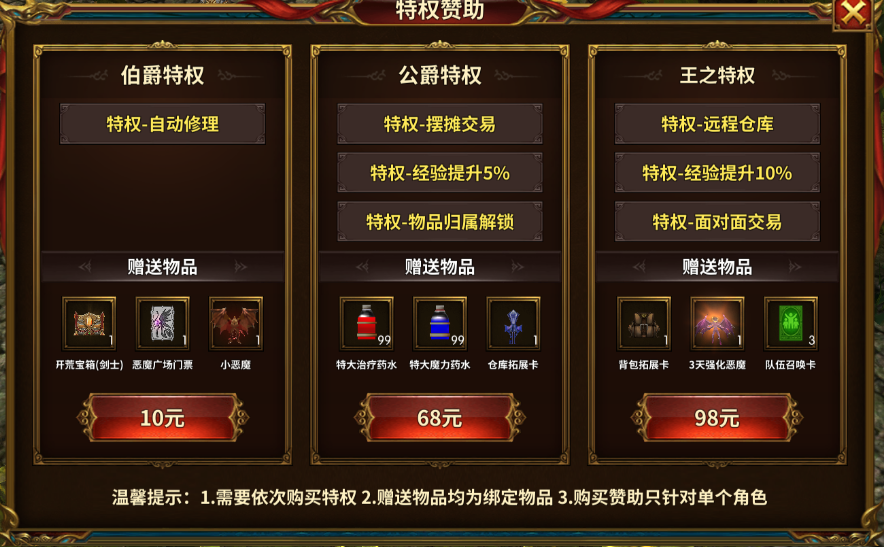 解锁交易特权:只需78元,开通伯爵与公爵特权,解锁自动修理与摆摊交易功能,开启你的财富之旅。这78元,是你通往财富自由的“金钥匙”,让你在游戏中畅行无阻,轻松交易,赚得盆满钵满!
