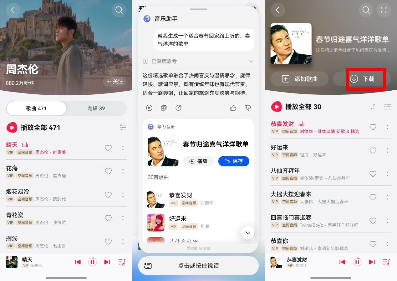 不知道听什么还可以直接让“音乐助手”推荐歌单。过年就想要喜气洋洋的氛围,点开华为音乐【我的】页面里彩色按钮,唤醒音乐助手说:“帮我推荐一些适合春节回家路上听的、喜气洋洋的歌单。”它根据我平时听歌喜好,几秒钟就能生成一份喜气洋洋又好听的歌单,不仅有过年必听的经典歌,还穿插了不少节奏欢快的流行金曲,听得我归心似箭,感觉脚下的路都带风,恨不得赶紧回家和家人热热闹闹过年。还能选择“超高清音频”或“空间音频”音质,一键缓存到本地,哪怕路上没网络,也不影响我的“白月光”在耳边开live!