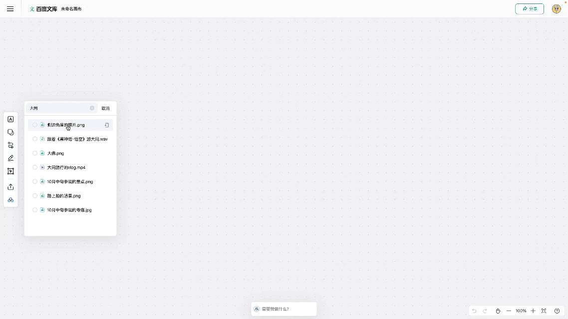 而在“自由画布”里面,整个流程就变得十分简单,只需要将百度网盘中的素材一起拖入画布,不管是视频还是音频图片或是文档,都能无门槛进画布。
