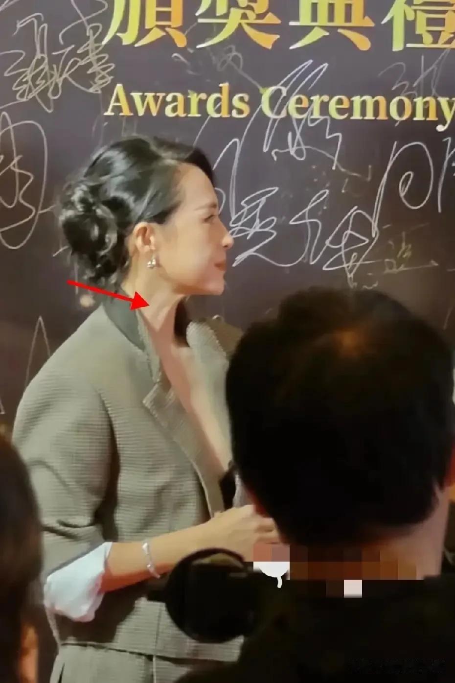 46岁的章子怡没有发腮没有松弛下垂,脸上的皮肤紧致透亮,但岁月不饶人,脖子上皮肤松弛还是出卖了她的年龄。