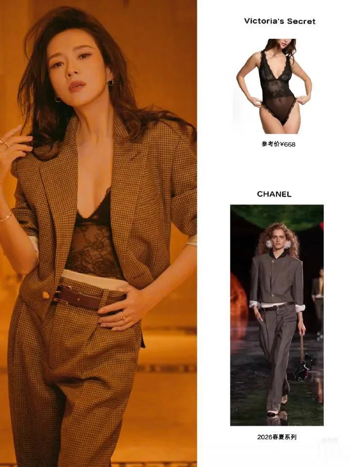 相比起来,章子怡蕾丝内搭就显得大胆多了。内搭很低,章子怡穿着有一种老实人豁出去的感觉。
