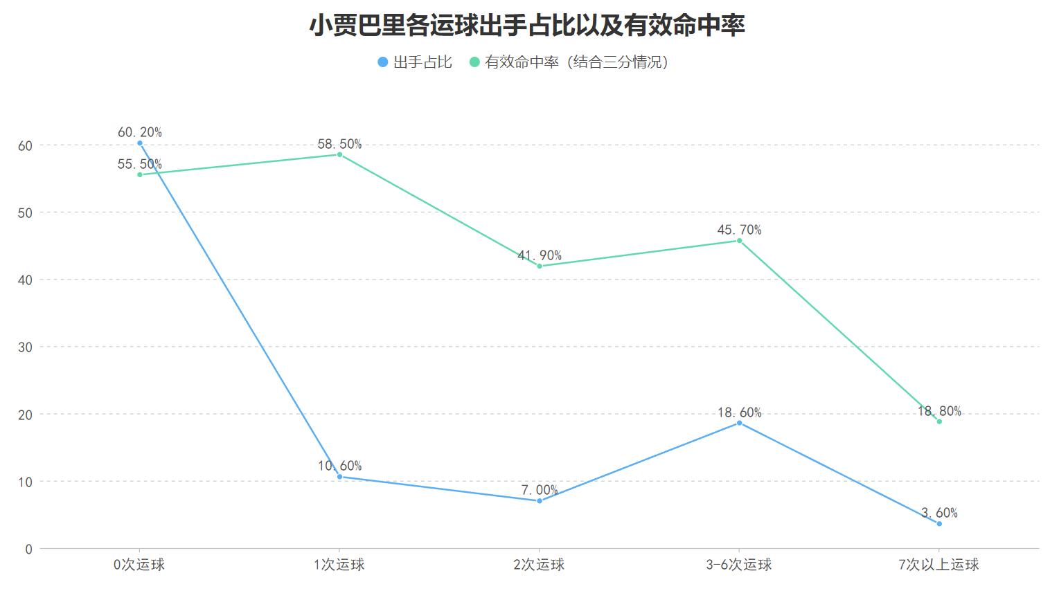 小贾本赛季接球不运球的出手占比高达60.2%,运球两次以内的出手占比也有17.6%,同时小贾不运球与1次运球出手的运动战,也就是结合三分情况的有效命中率可以达到更高水准,因此小贾最适合接球后短暂调整的直接出手,这样是他最喜欢也是最擅长的得分方式,虽然有明显的缺陷但对于火箭而言正需要他的这种接球出手的能力: