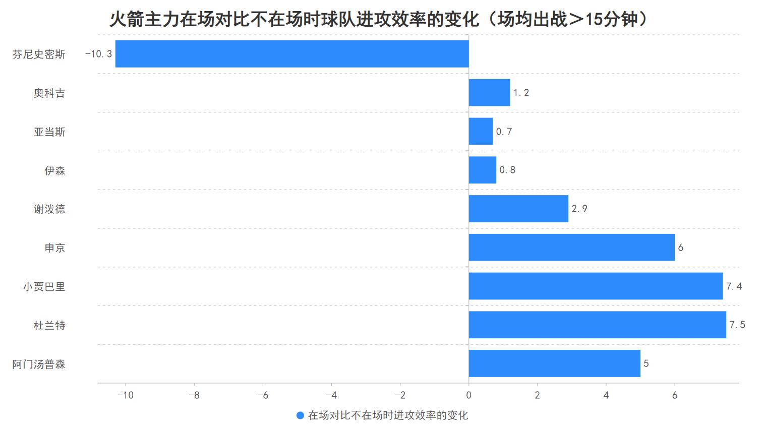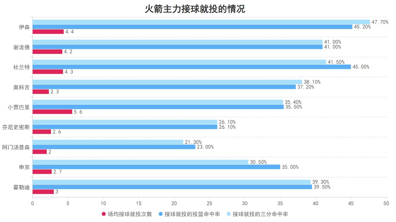 小贾本赛季场均有5.6次全队最多的接球就投,虽然接球就投的投篮命中率以及三分命中率都不算高但结合出手数已经是火箭队内相对高效的球员了,因此当小贾在场时火箭属于既有人提供突破与分球,也有人提供外线火力支持,因此小贾的发挥非常关键,伊森原本也可以完美发挥这样的作用但乌度卡却时常不给他出场机会并且还有伤病的问题。