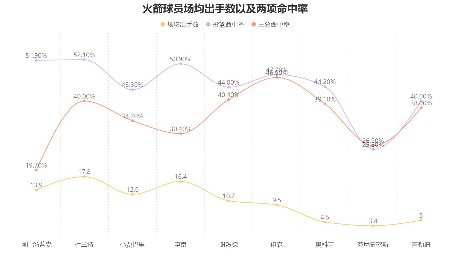 外线有人能惩罚对手的收缩防守时,火箭才更有突破机会让整体进攻流畅起来,虽然小贾连败期间的表现不稳定,但从本赛季来看他的两项命中率也没低到夸张的地步至少是及格水准,并且投射比他更好的谢泼德、奥科吉与霍勒迪分别有着防守与产量的问题,因此小贾在场时能够大幅度提升进攻效率,而且他的投射如果能更稳定高效那么火箭的上限也会更高。