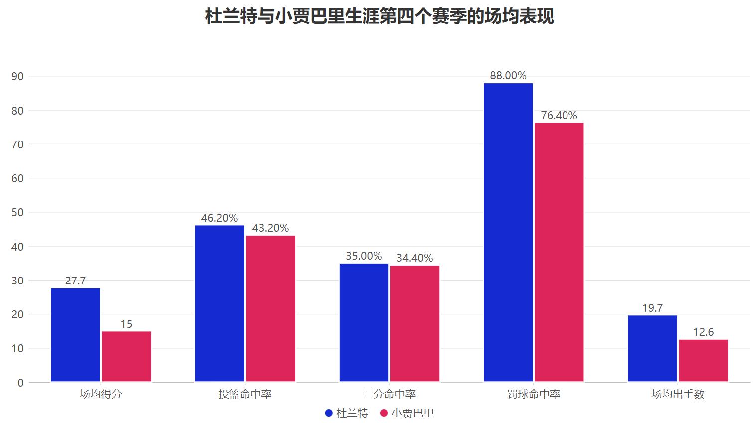 小贾从身体硬件与天赋来看可谓是小号版本的杜兰特,他具有2.11米的身高却是能内能外的得分手,一手面对防守的强投也神似杜兰特,但已经来到第四个赛季的小贾对比同期的杜兰特可谓是天差地别:杜兰特的第四个赛季已经是蝉联得分王并且带队杀入西决了,而小贾无论是数据还是成绩都显然是相差甚远,但小贾对于目前的火箭队而言却有难以被取代的作用。