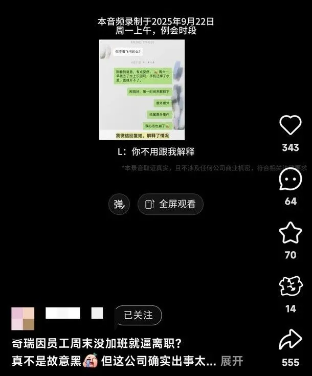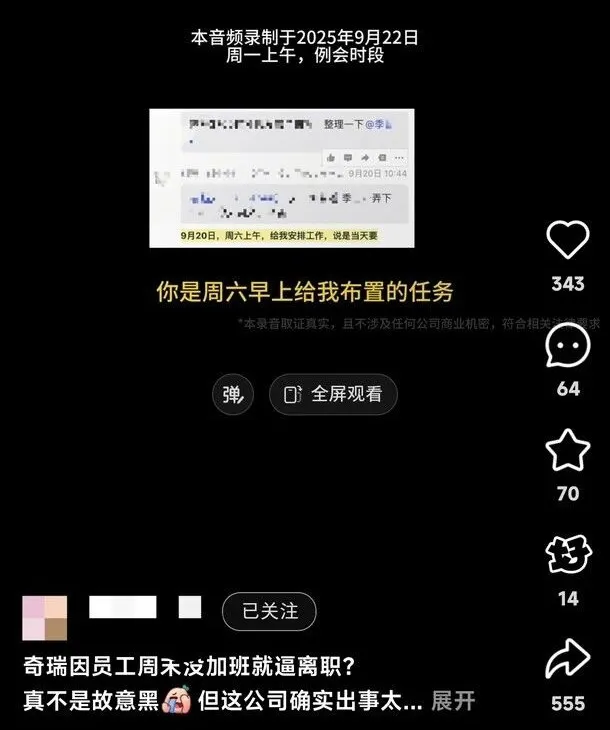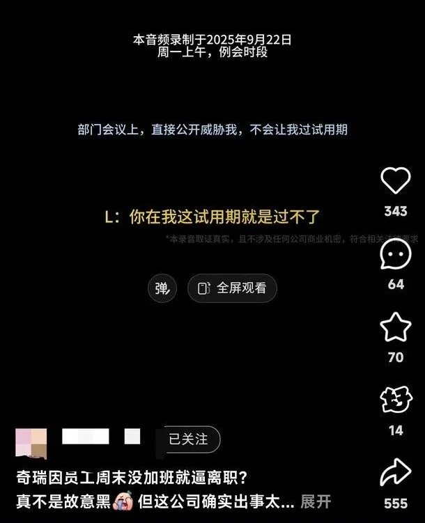 网传一段奇瑞校招生与上级领导的录音,内容大概是领导周六10点多给下属发消息,下属已出门未能及时回复,耽误了工作,被领导痛批,最后领导摔门离开,并表示不让下属通过试用期。