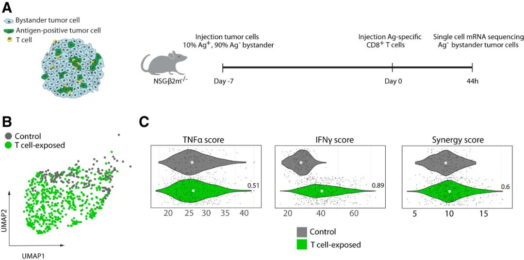 在完成上述特殊处理后,研究者们将癌细胞和CD8+T细胞植入小鼠体内,并给免疫细胞浸润留出足够的时间,至此,研究正式拉开帷幕。第一步分析结果就令人震惊:来自CD8+T细胞的细胞因子确实能够重塑微环境中癌细胞的转录组。超过70%的“旁观癌细胞”都出现了IFNγ诱导基因集的表达水平改变,而仅有5.3%的细胞会受到TNFα的明显影响,这些细胞与未暴露于CD8+T细胞的肿瘤几乎没有差异。