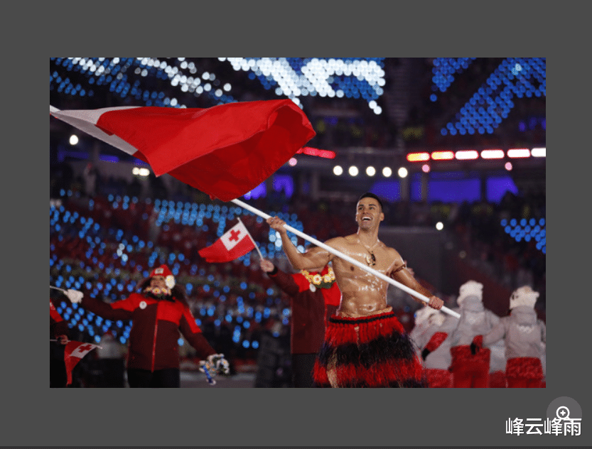 2018平昌冬奥会开幕式时的“汤加肌肉男”陶法托富阿。在零下8度的严寒中也赤膊入场。