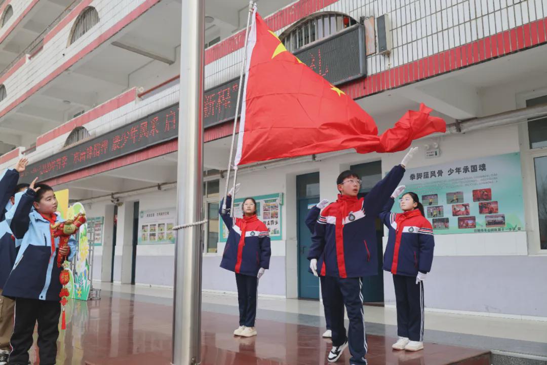 开学典礼在庄严的升旗仪式中拉开序幕。“升国旗,奏国歌,全体少先队员敬礼!”随着指令下达,雄壮的《义勇军进行曲》响彻校园,旗手振臂挥旗,五星红旗迎风舒展、缓缓升起。全校师生肃立齐唱国歌,嘹亮的歌声传递着对祖国的深情与新学期的庄严承诺。