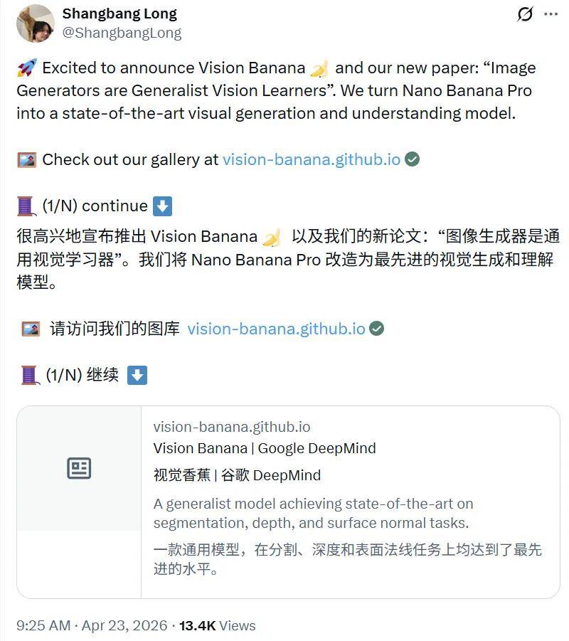 该论文提出的 Vision Banana,基座就是那个名为 Nano Banana Pro (NBP) 的图像生成模型。